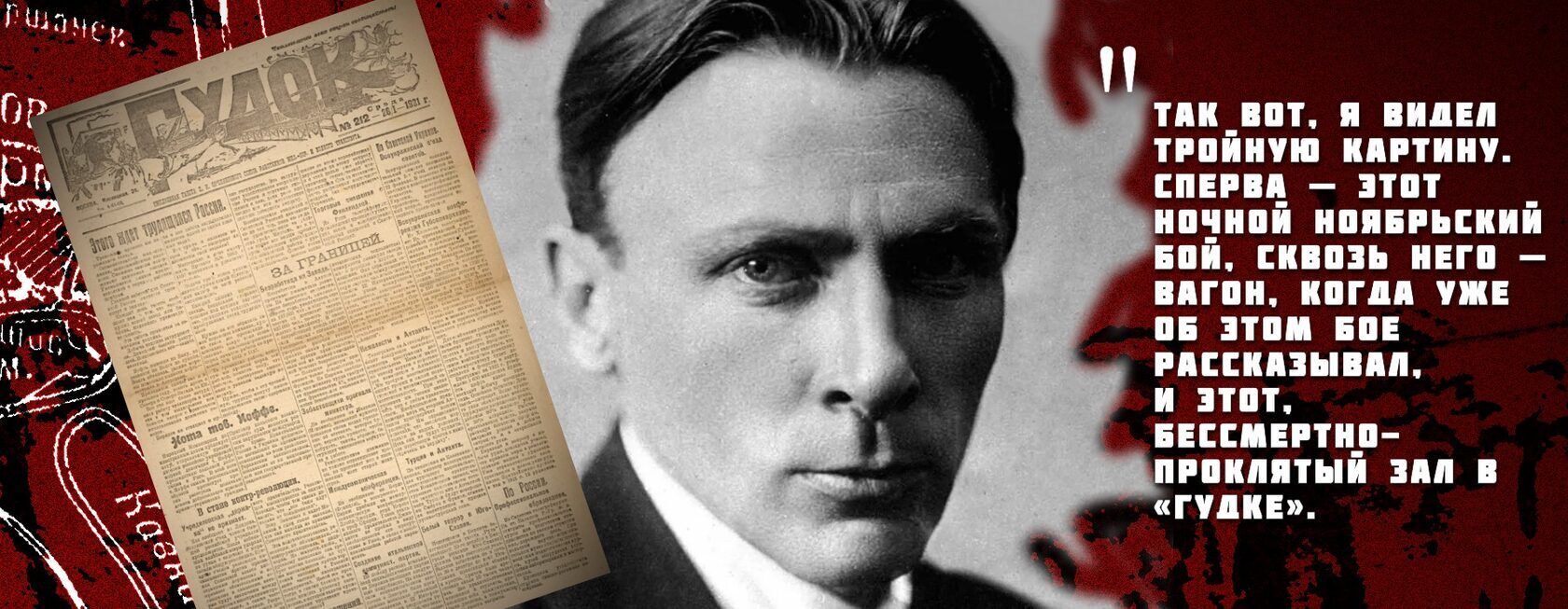 Меня контузило через полчаса после него. Так вот, я видел тройную картину. Сначала — этот ночной ноябрьский бой, сквозь него — вагон, когда я уже рассказывал об этом бое, и этот бессмертно-проклятый зал в «Гудке». «Блажен, кого постиг бой». Меня он постиг мало, и я должен получить свою порцию...