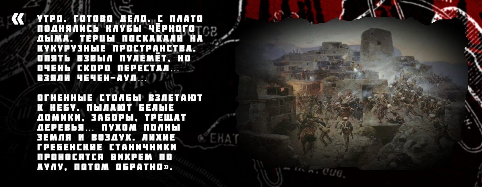 «Утро. Готово дело. С плато поднялись клубы чёрного дыма. Терцы поскакали на кукурузные пространства. Опять взвыл пулемёт, но очень скоро перестал… Взяли Чечен-аул… Огненные столбы взлетают к небу. Пылают белые домики, заборы, трещат деревья… Пухом полны земля и воздух. Лихие гребенские станичники проносятся вихрем по аулу, потом обратно».
