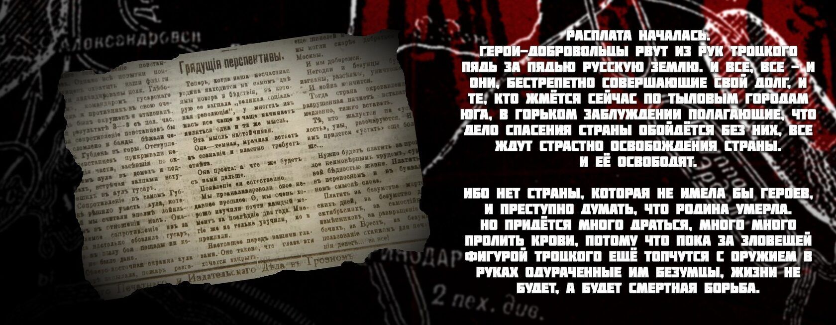 Герои-добровольцы пядь за пядью вырывают из рук Троцкого русскую землю. И все, все — и те, кто бесстрашно выполняет свой долг, и те, кто сейчас ютятся в тыловых городах на юге, в горьком заблуждении полагая, что дело спасения страны обойдётся без них, — все страстно ждут освобождения страны.