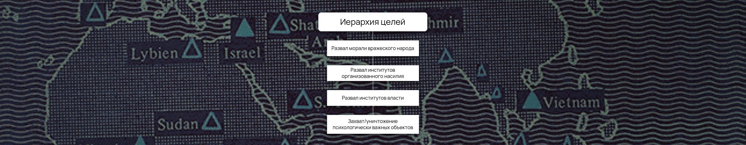 Прежде всего это развал морали вражеского народа. Следом должно идти уничтожение активной части механизма сопротивления объекта — армии, партизанских соединений, народных движений — словом, всех структурированных и хорошо замотивированных на борьбу сообществ. Дальше идёт уничтожение либо захват объектов психологической значимости.