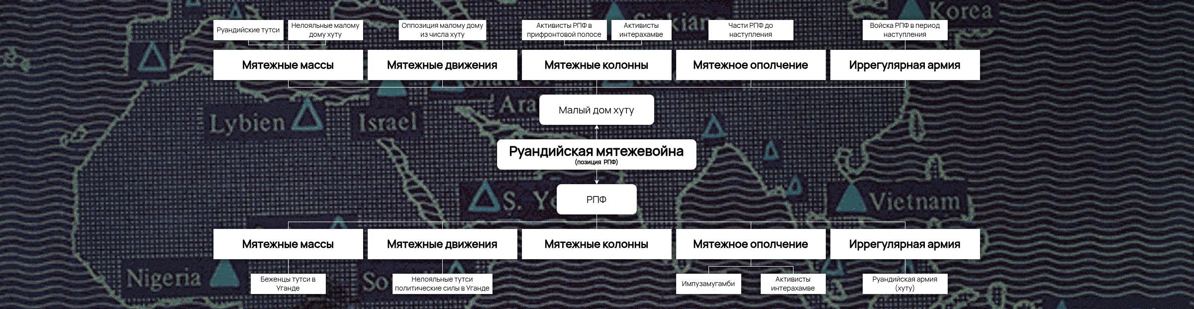 Активисты интерахамве, то есть радикалы хуту, фигурируют в обоих частях карты. С одной стороны, они выступали против Хабьяриманы и этим работали на долговременный успех РПФ. С другой стороны, это иррегулярные силы, которые истребляли мирных тутси и в этом плане были оппонентом РПФ.