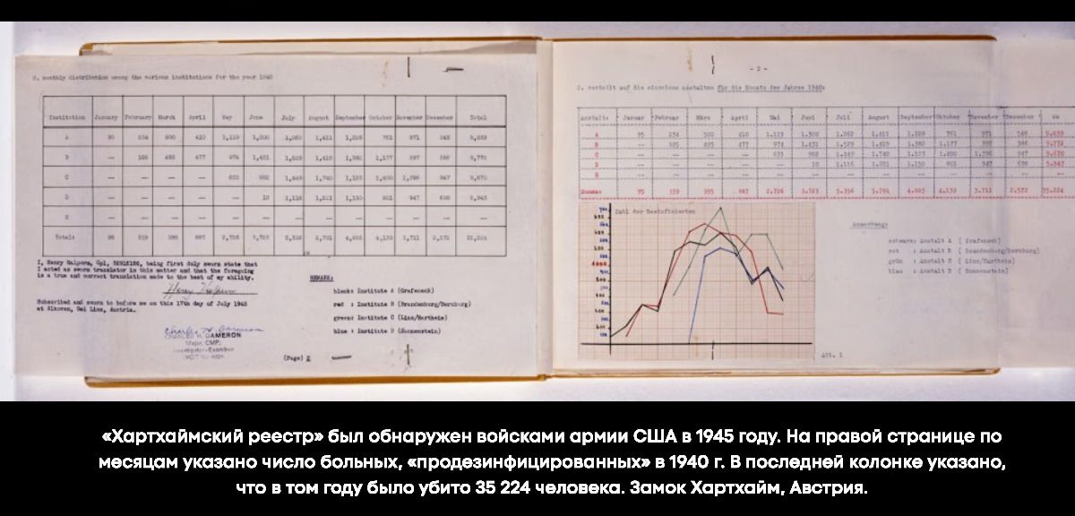Уже после того, как Германия и Австрия превратились в руины, в 1945 году в замке Хартхайм (по факту фабрике смерти) был обнаружен документ, в котором значились весьма интересные цифры и термины, их значение мы разъясним чуть позже: