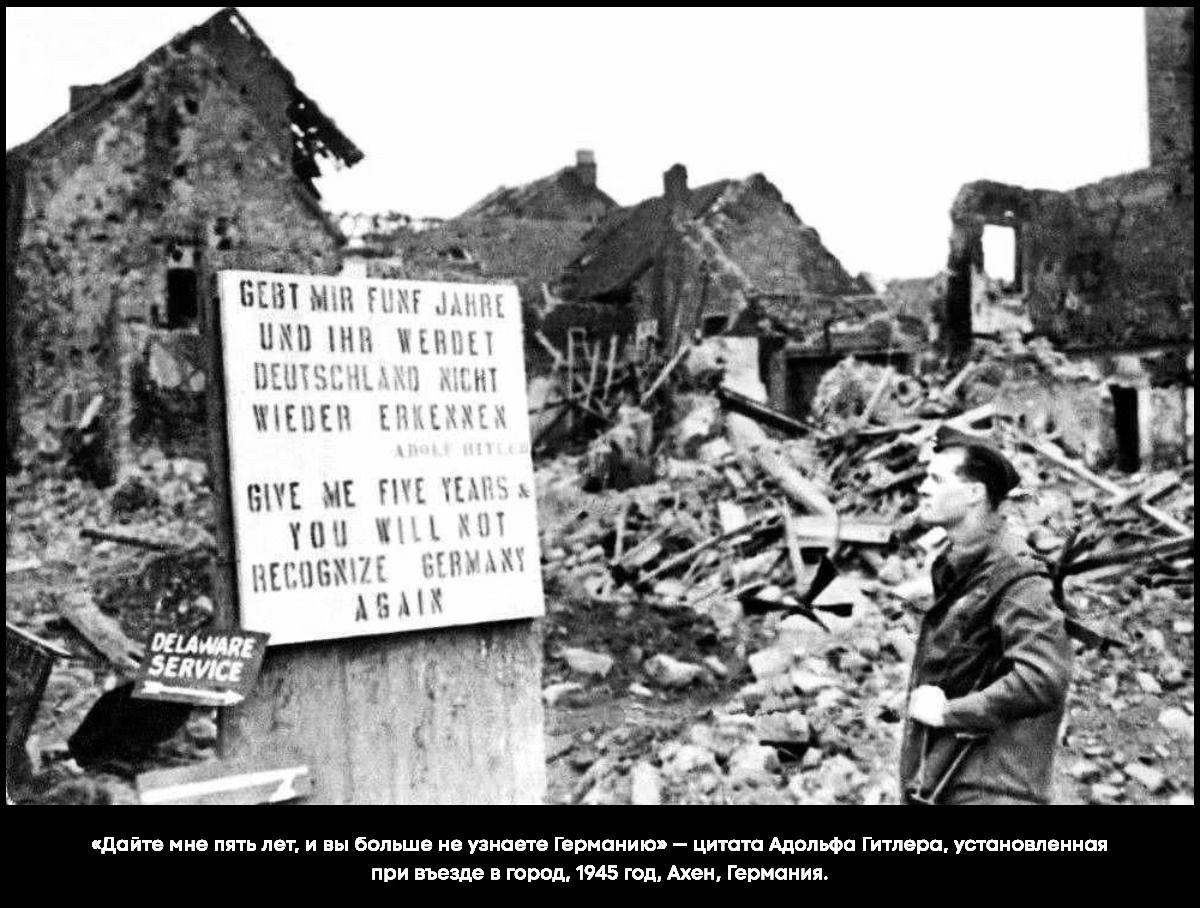 Ответ прост — война. Германия понесла тяжелейшие экономические и людские потери, которые составили 1,8 млн погибшими, 4,2 млн ранеными и около 800 тыс. мирных жителей, погибших в массе своей из-за экономической блокады и голода. Для немцев это была катастрофа — было потеряно 10% населения. Война затронула абсолютно всех — в каждой второй немецкой семье был либо погибший, либо раненый родственник.